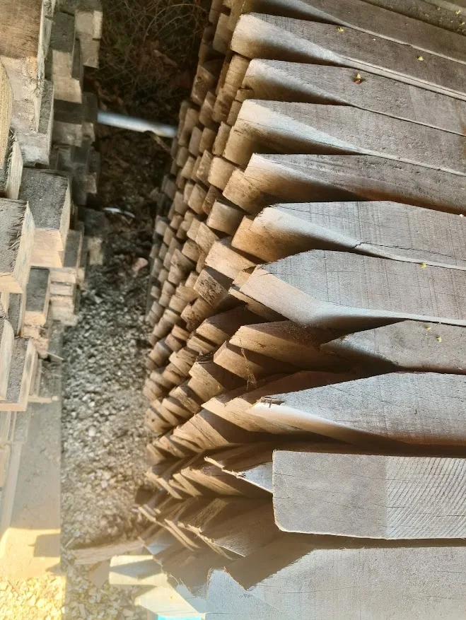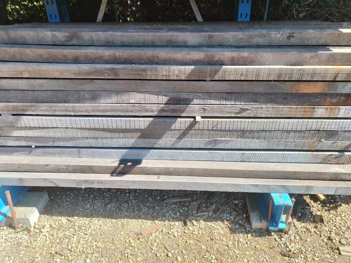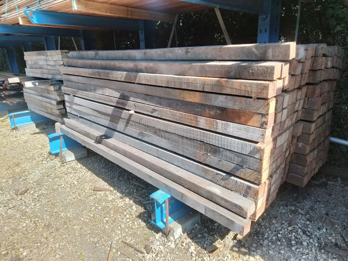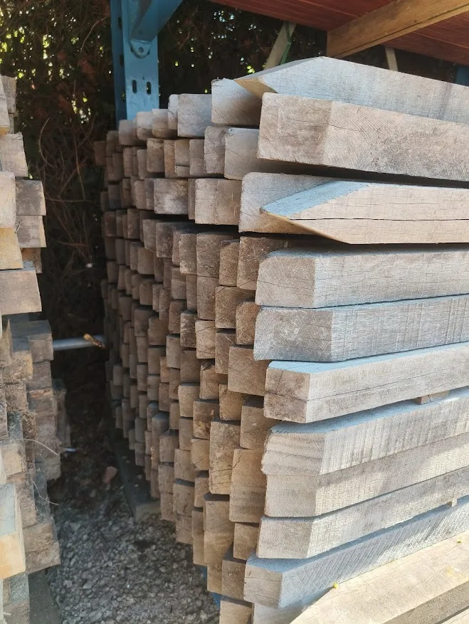 Herkomst: Deze palen zijn gerecupereerd uit de afbraak van wandelpaden in moerasgebieden en kleine wandelsteigers. Ze zijn vervaardigd uit Piquiá, een uiterst duurzame tropische hardhoutsoort. De delen die in de grond zaten verkeren nog in uitstekende staat; minder kwalitatieve stukken werden verwijderd, waardoor enkel solide en bruikbare palen overblijven.