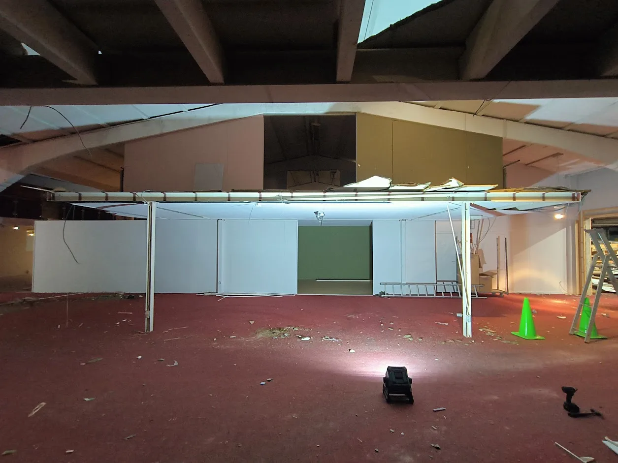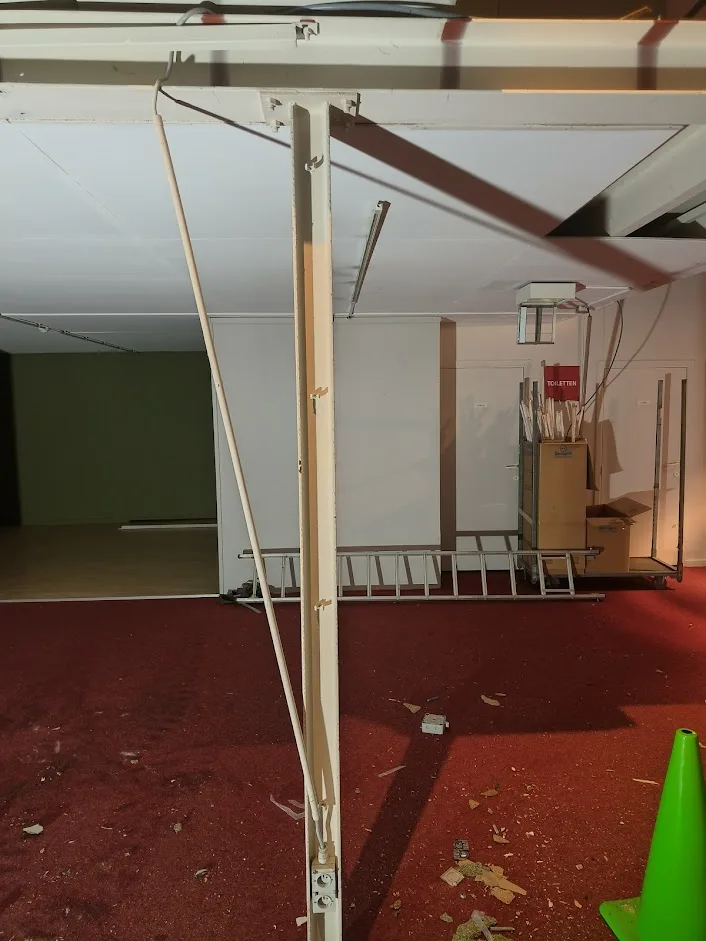 Deze stalen constructie is een modulaire tussenverdieping die gebruikt werd in een hangaar. Het systeem bestaat uit stalen kolommen, liggers en houten draagbalken die samen een stevige vloerstructuur vormen.