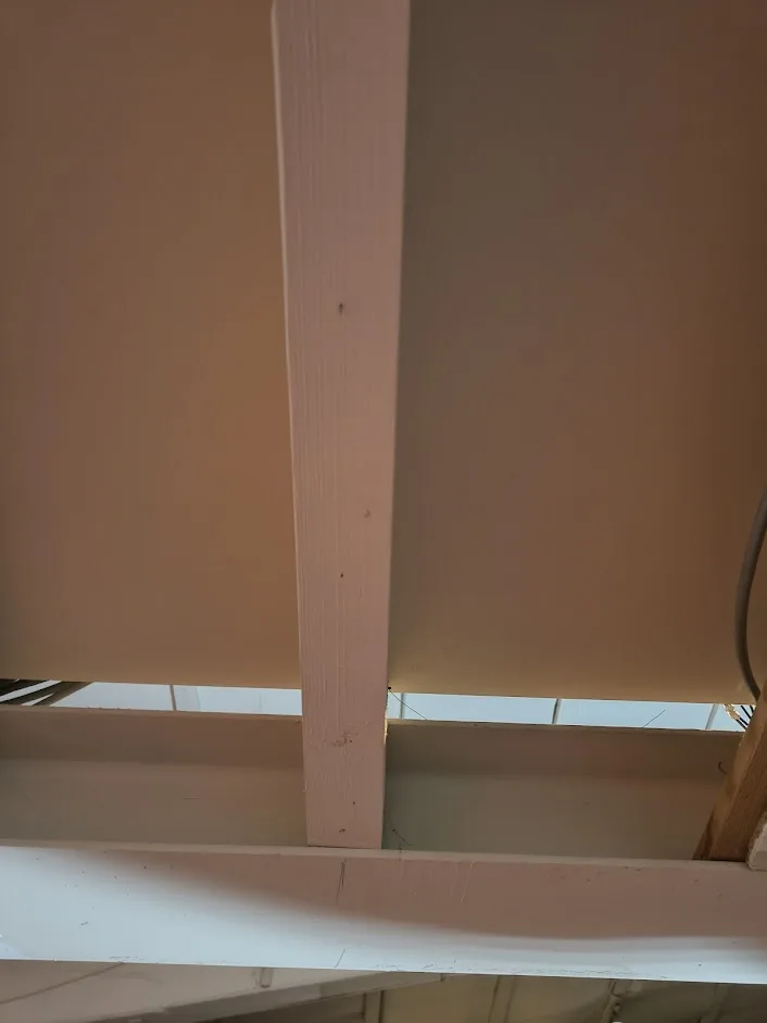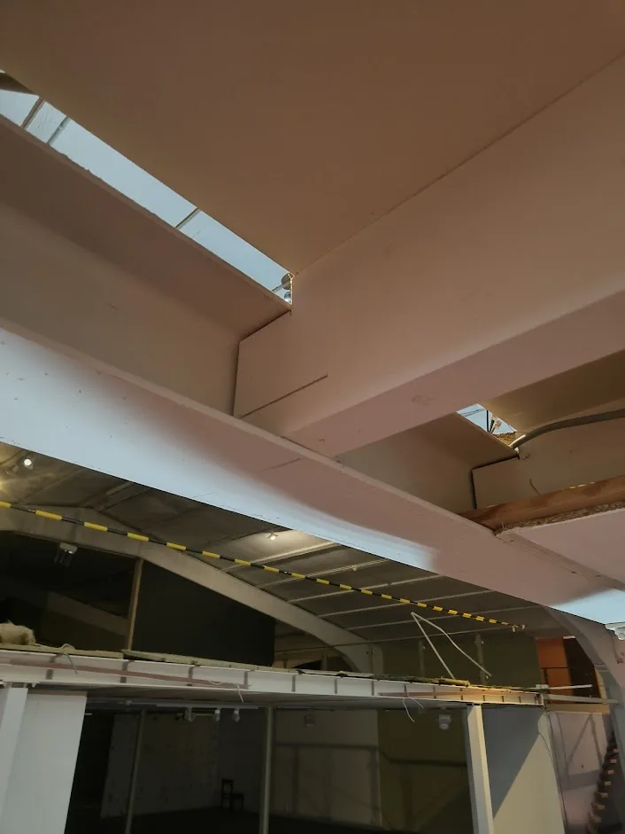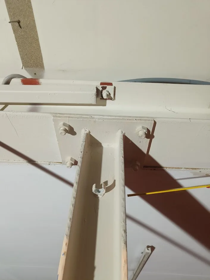 Twee van deze frames worden in het vloeroppervlak met elkaar verbonden door een stalen kruisverband en 18 grenen draagbalken die de vloer van de tussenverdieping dragen. Deze houten balken hebben een afmeting van 19 x 6,5 x 400 cm.