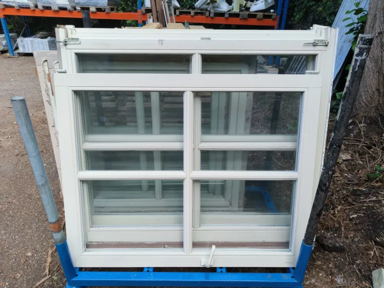 Oorsprong: Gerecupereerd hardhout raam met dubbel glas, inclusief kader.