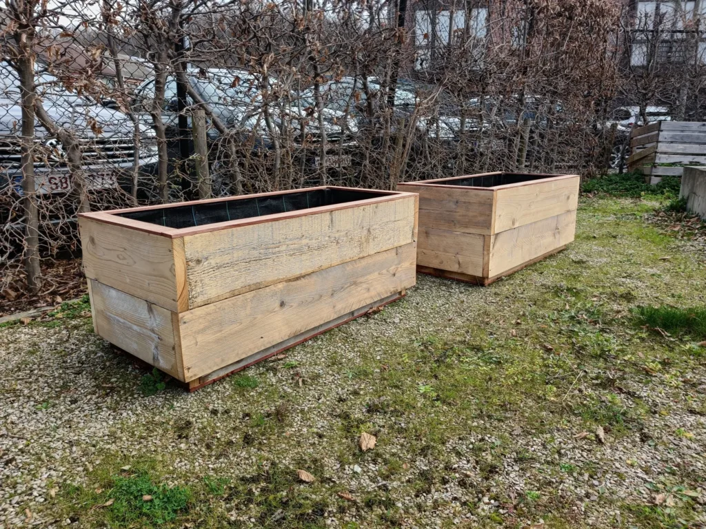 Voor buurttuin “De Kessel-tuin” maakten we met gebruikte steigerhoutenplanken deze plantenbakken op maat.De hardhouten afwerking onder- en bovenaan zorgt voor een langere levensduur.