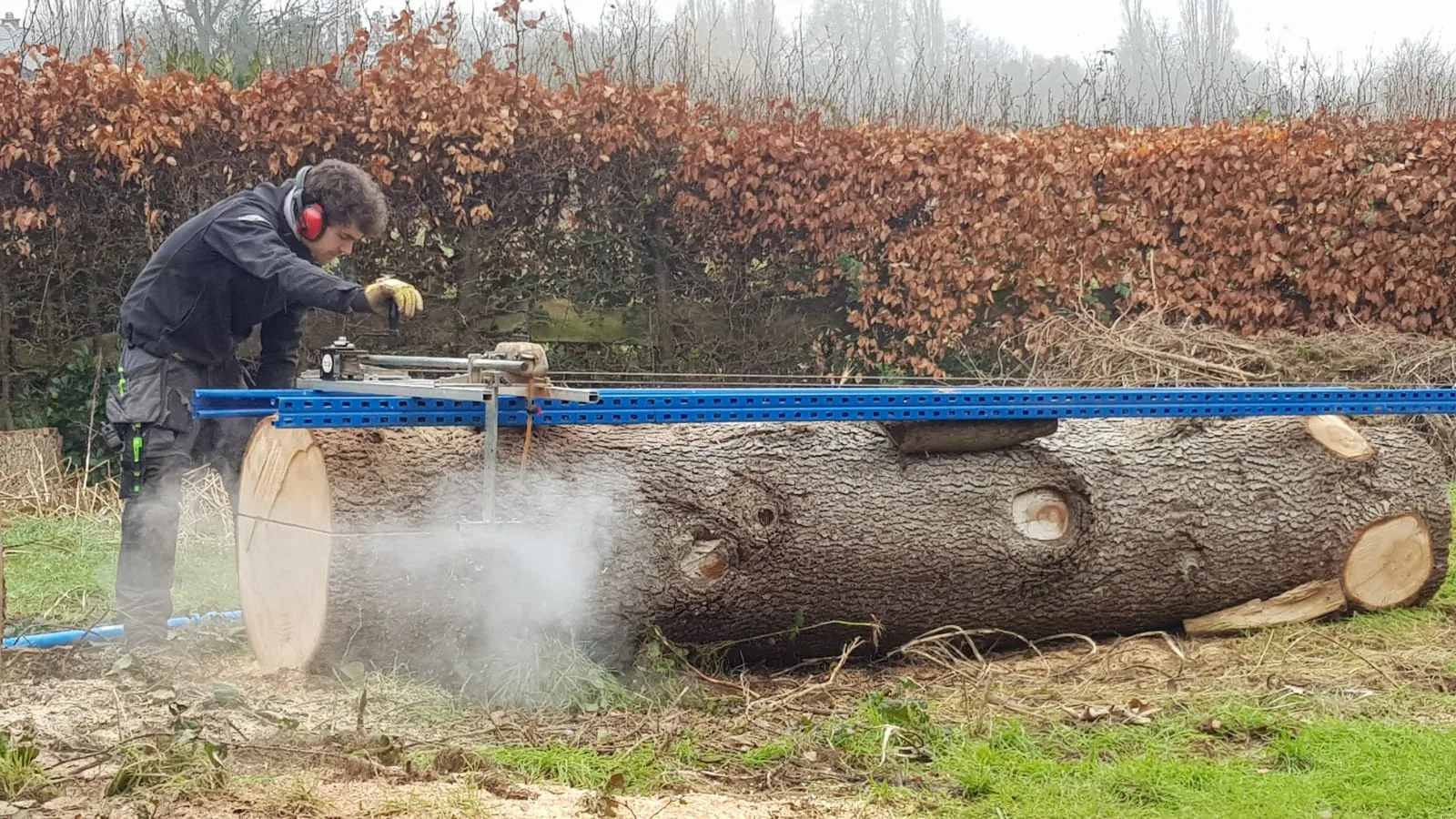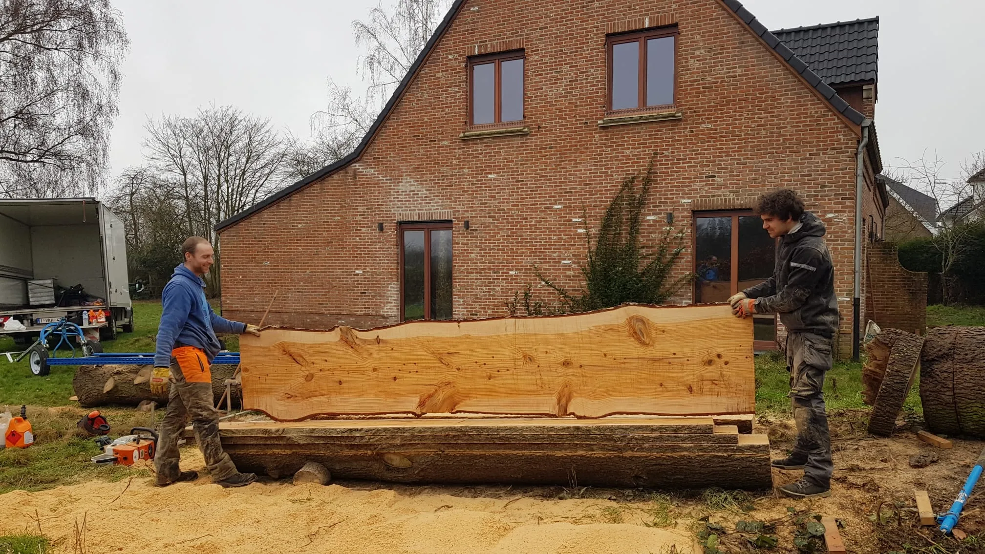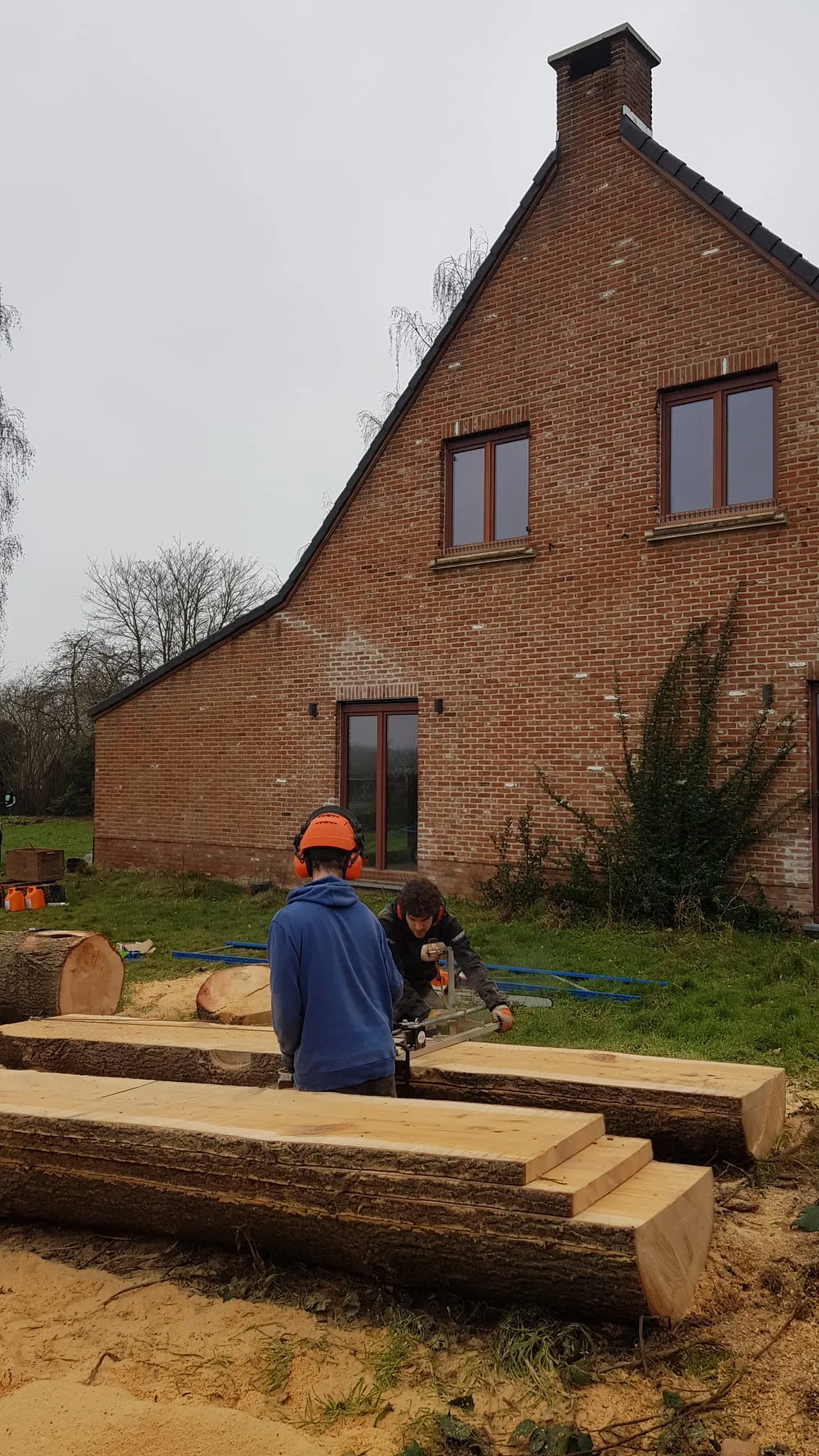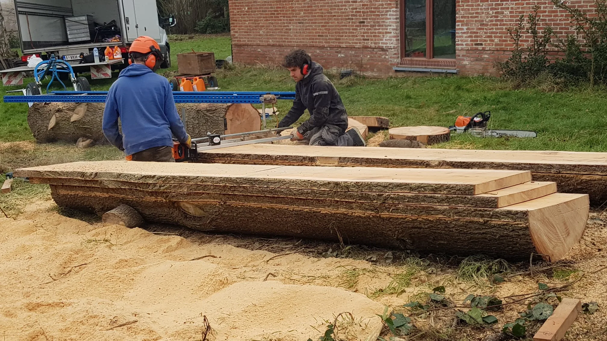 De boom werd zorgvuldig omgedaan door Boomwerken Van Bever, waarna wij met onze mobiele boomzaag ter plaatse gingen om de stam te verzagen tot schaaldelen. Zo bleef het volledige traject, van boom tot plank, lokaal en transparant.