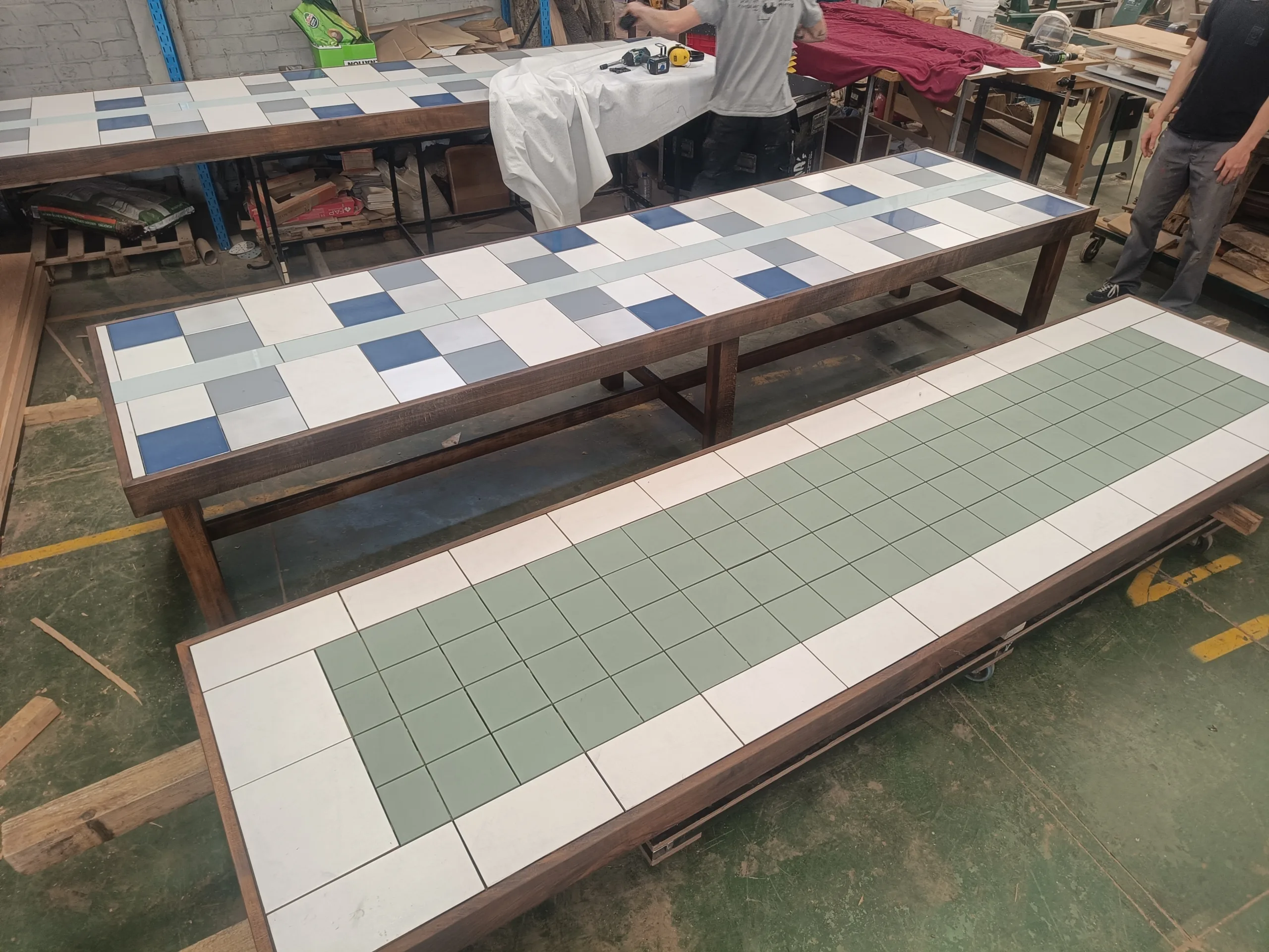 De tafels zijn volledig opgebouwd uit hergebruikte materialen: