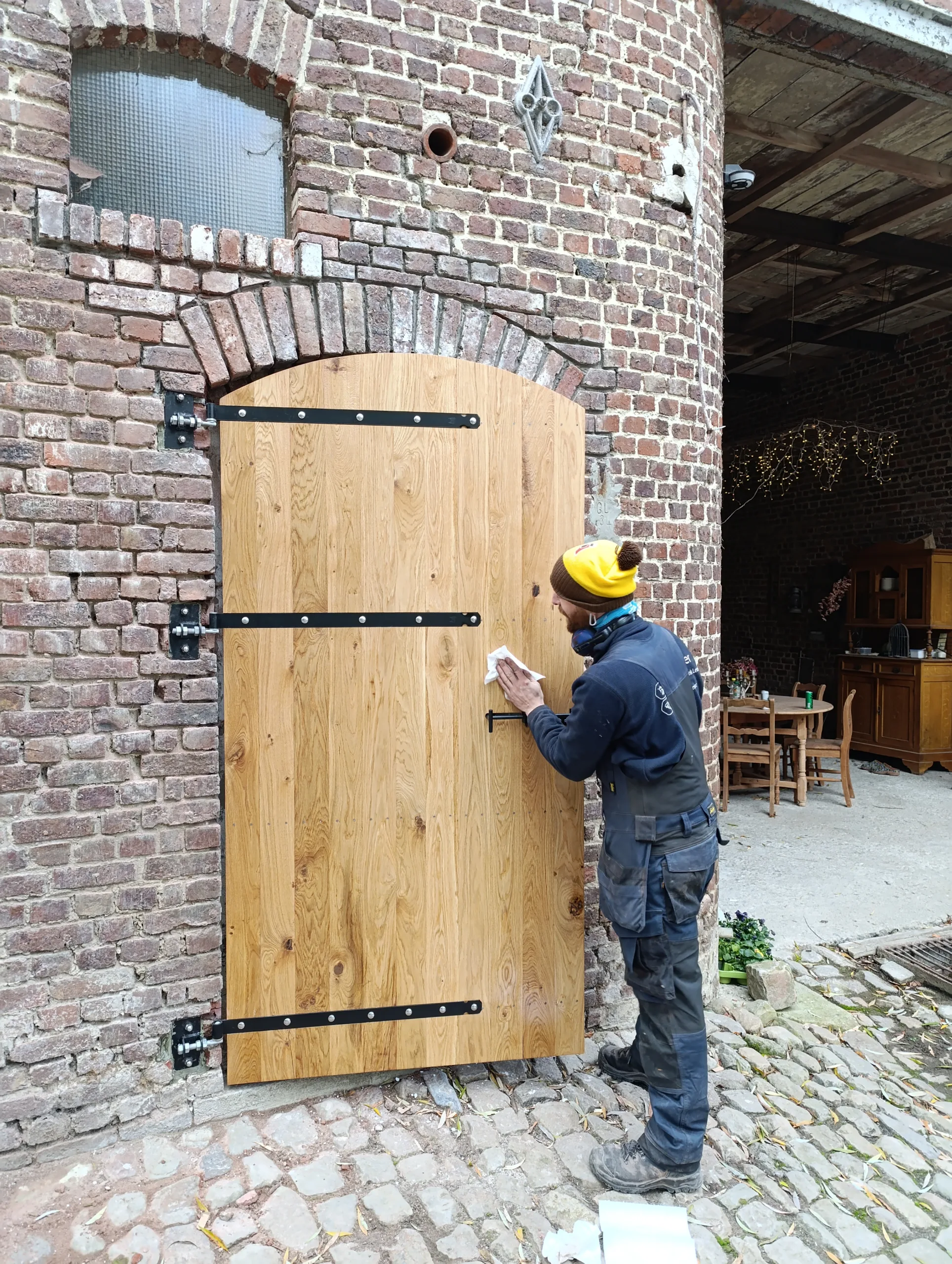 Ook het beslag kreeg extra aandacht. Het slot werd volledig op maat gelast, zodat het perfect geïntegreerd is in het ontwerp en bijdraagt aan de authentieke uitstraling van de deuren.