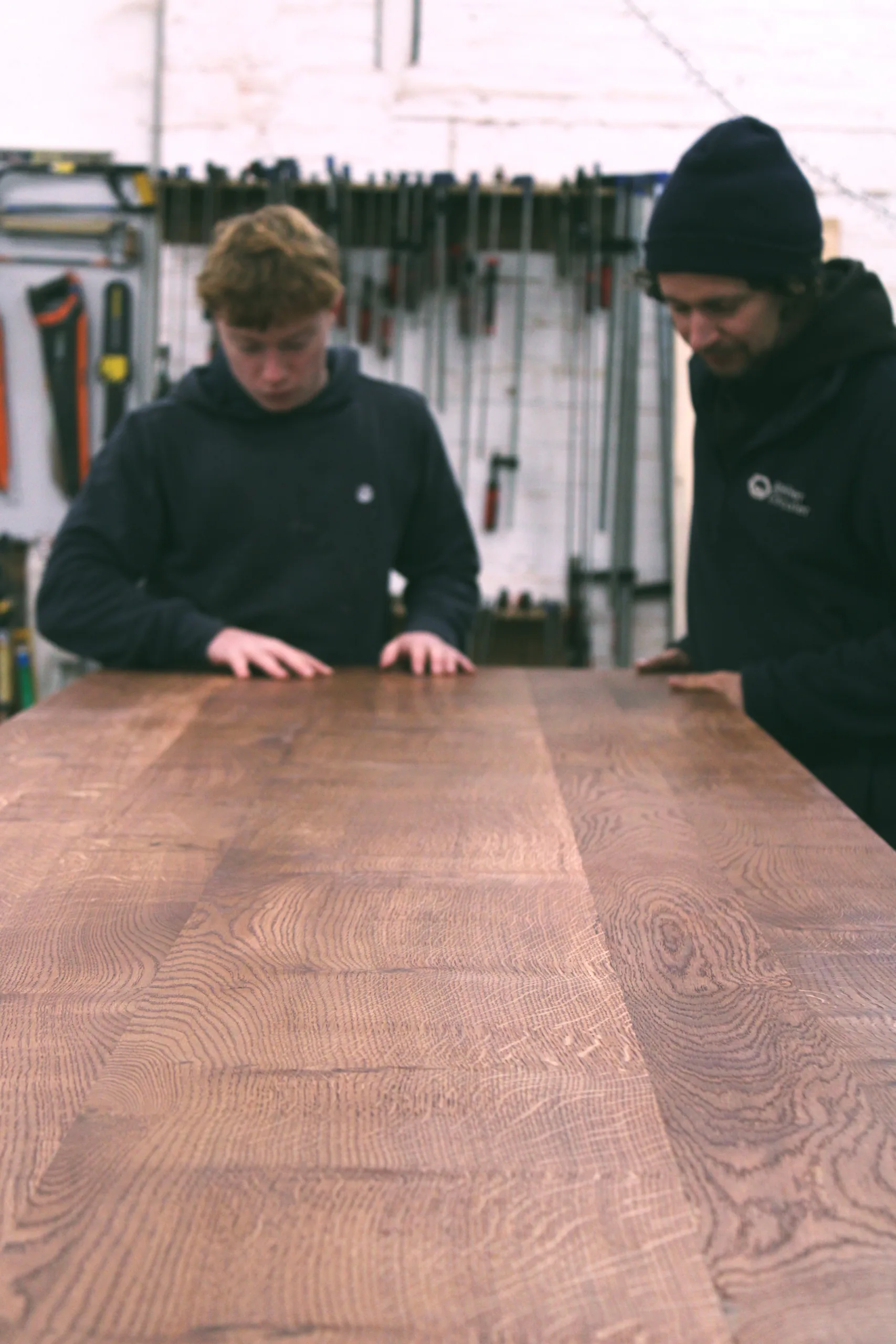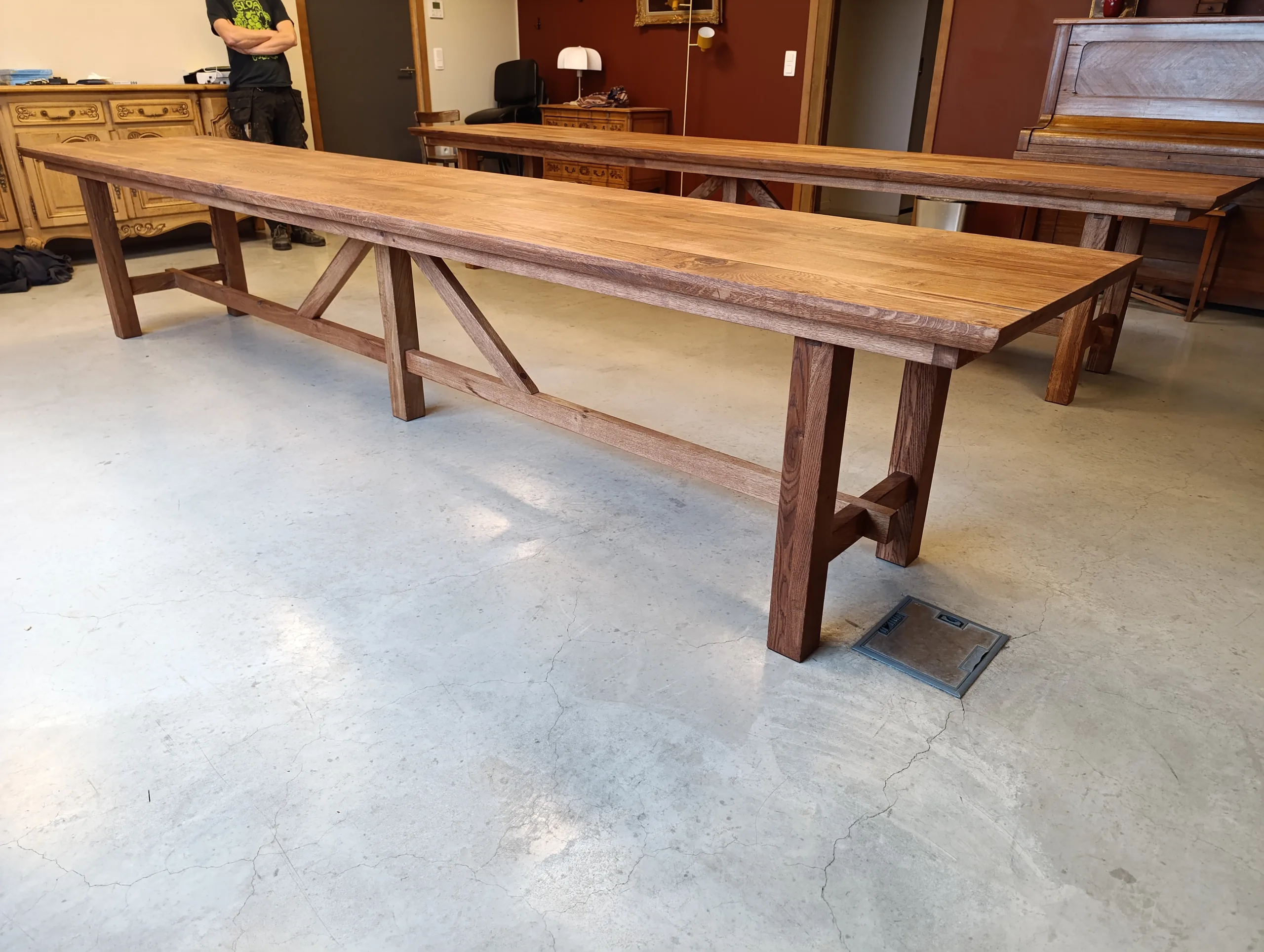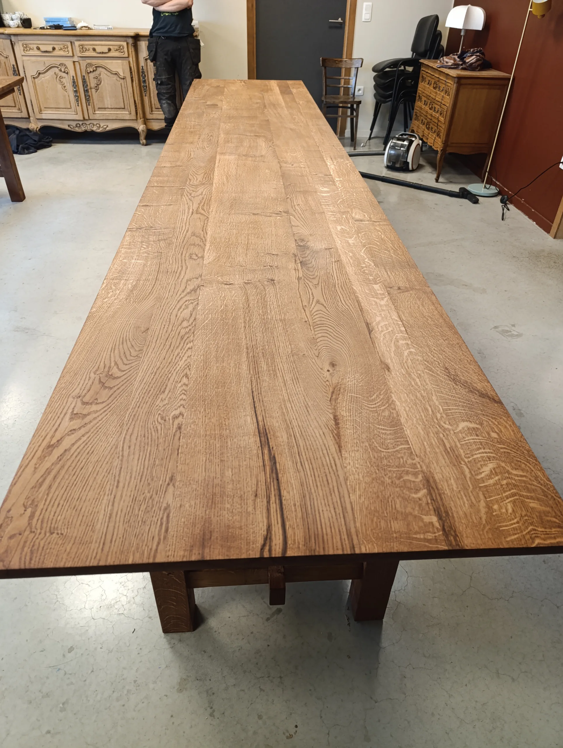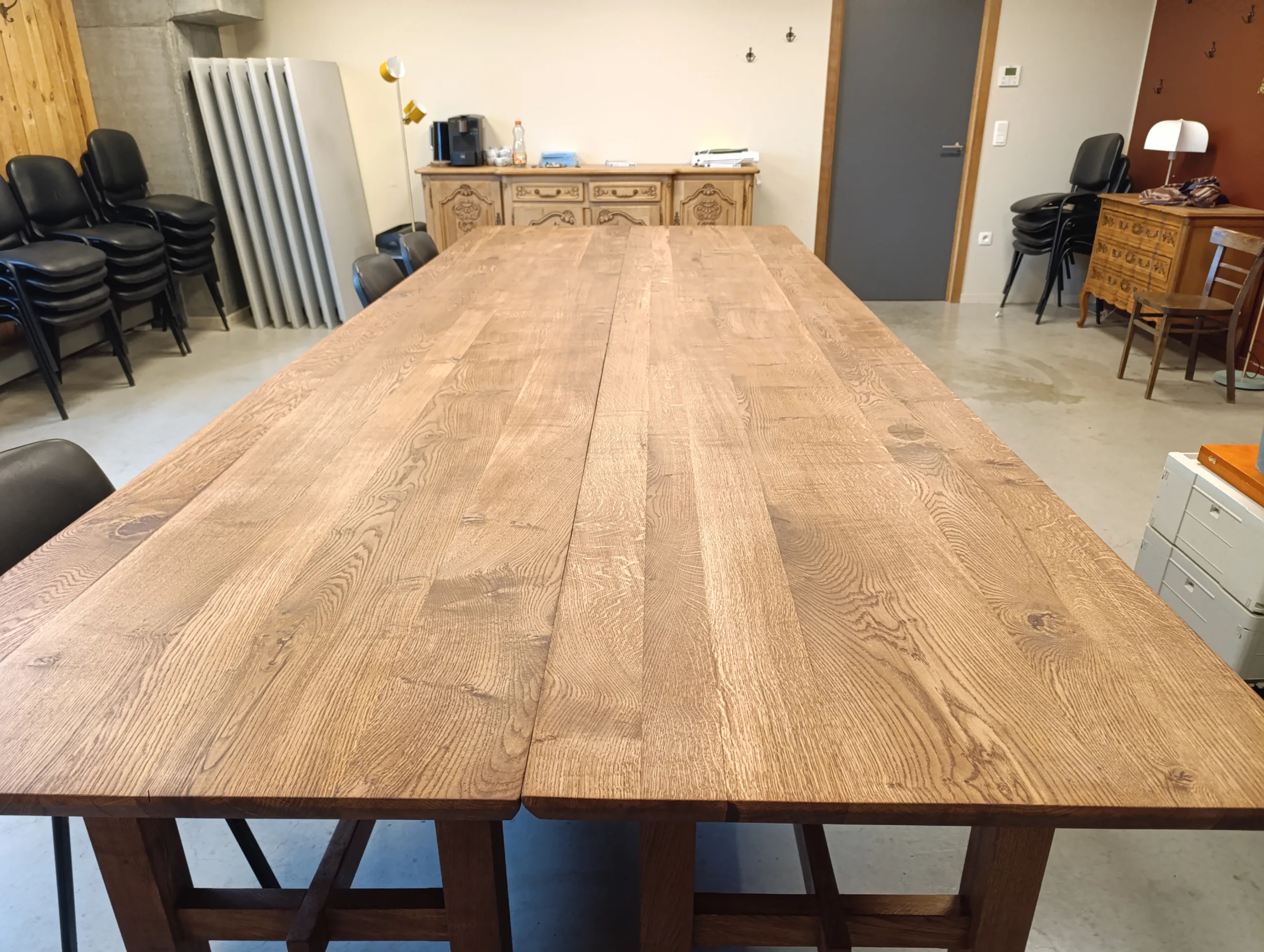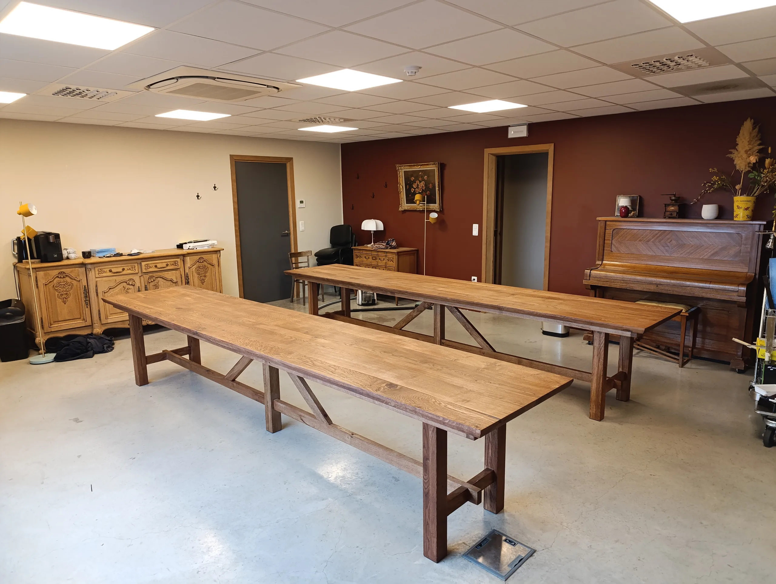 De 4 meter lange tafels zijn gemaakt van Europese eik. Het hout is afkomstig van een lokaal gevallen boom en werd geleverd door Recup wood, die net zoals ons een verdeler is van gerecupereerd hout.