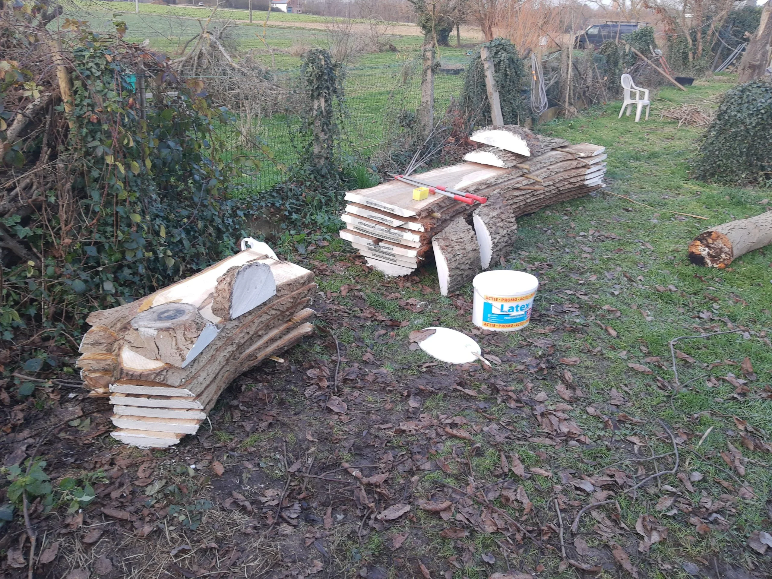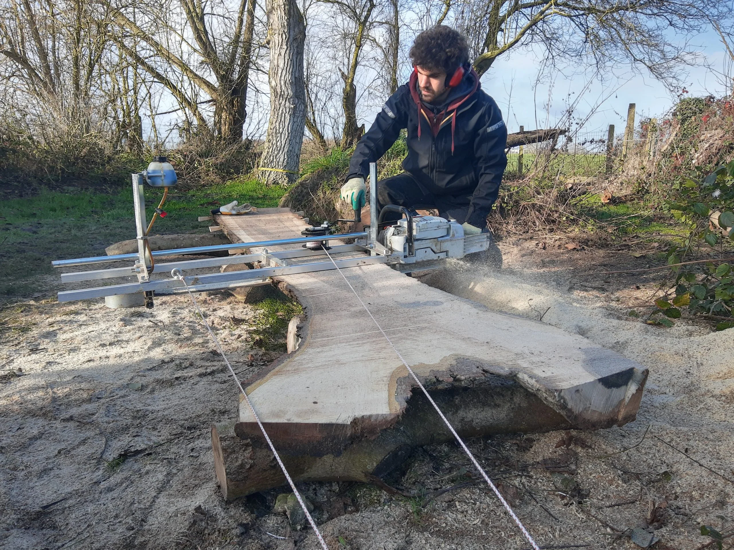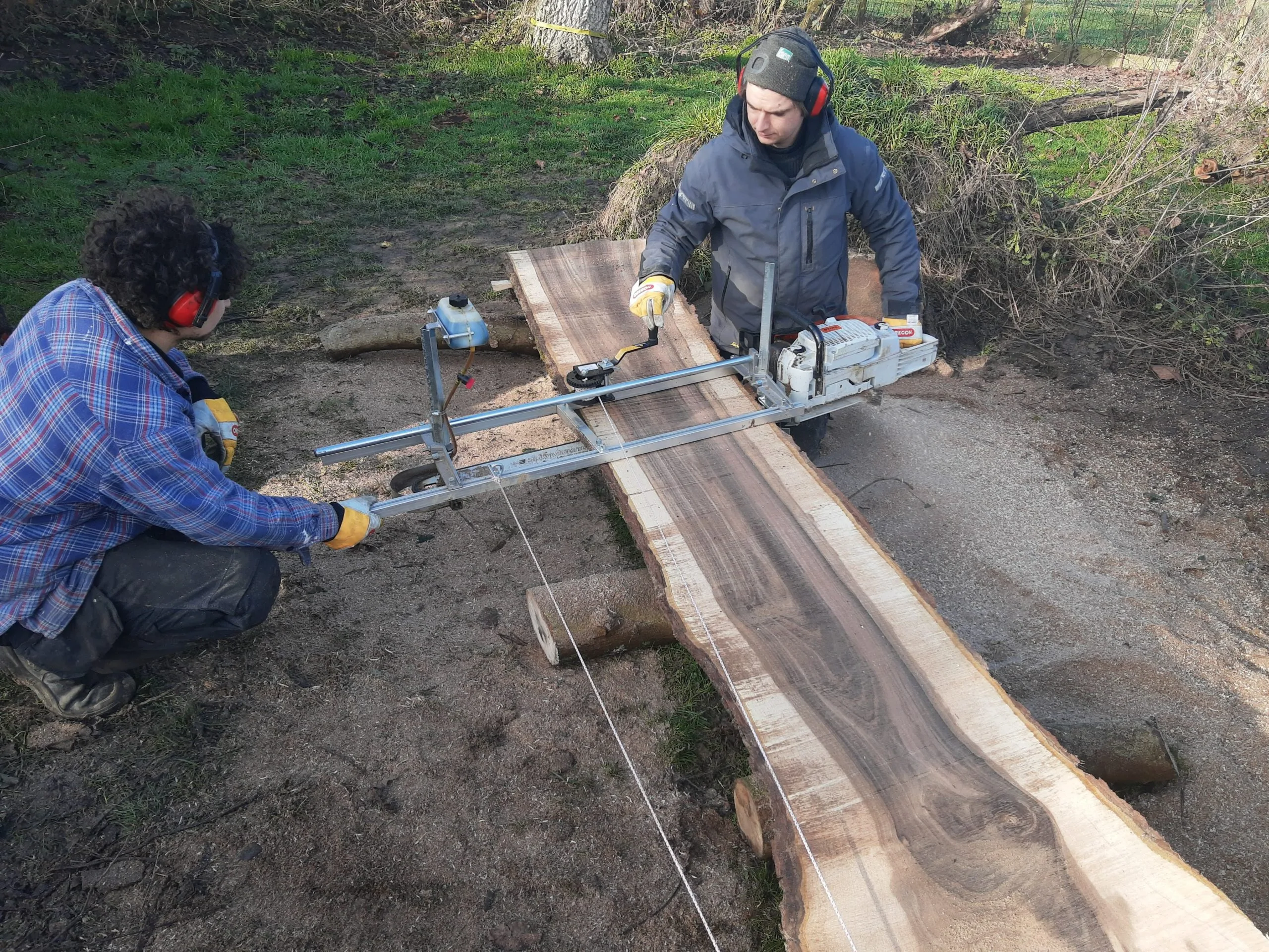 Een storm had – helaas – deze oude walnotenboom geveld. De boom lag er al zo’n drie jaar en de eigenaar vond dat het tijd was om er iets mee te doen. Het zou zonde zijn om het prachtige hout van een walnotenboom als brandhout te gebruiken. Dus verzaagden we de boom tot planken. In ruil wilde de eigenaar een mooie plank om er zelf een bank mee te maken.
